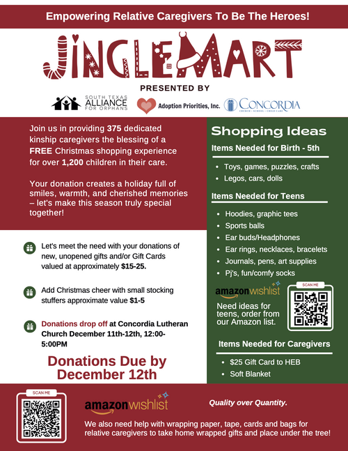 This is a Christmas drive at Concordia Lutheran. Throughout the month of November, we will collect donations of child and teen items that are requested by STAFO, such as toys, puzzles, gift cards, athletic balls/gears, headphones, portable charges, blankets, socks, affordable/trendy jewelry.