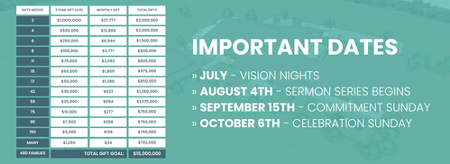 Our SECONDARY GOAL is to raise fifteen million dollars in generous gifts over the next three years, above and beyond regular tithe and offerings, so that we can move forward to where we believe God is calling us NEXT.